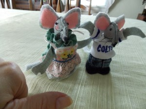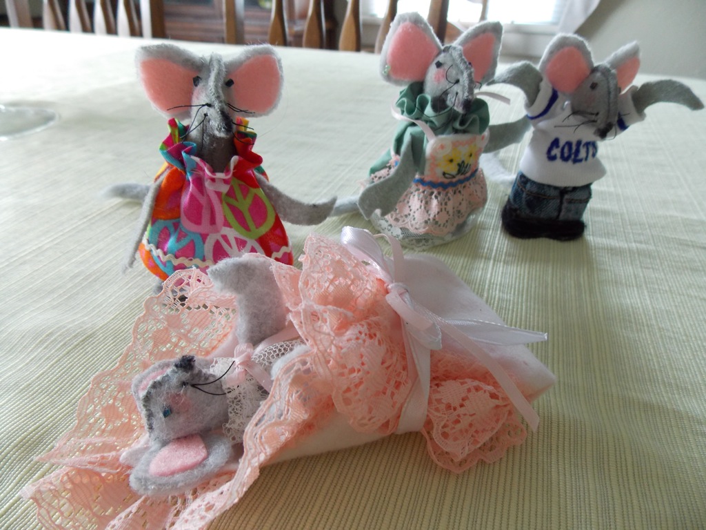I usually make choir mice as Christmas ornaments wearing red choir gowns and holding hymnals. But my granddaughter needed some families” for her dollhouse, so I made a mouse family since she is an animal aficionado. Her dad is a Colts fan, so of course, so is Papa Mouse.